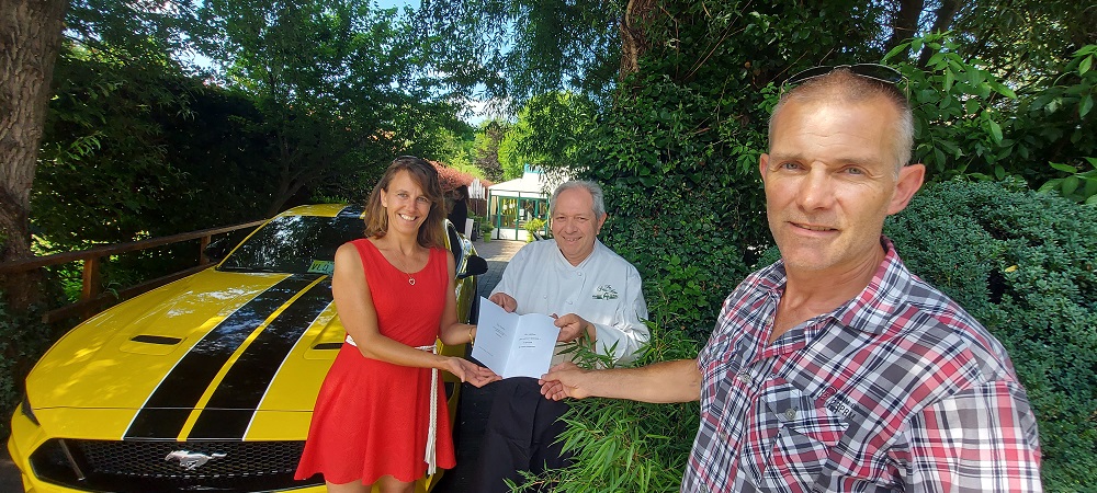 Comme chaque année, The Golden Horse offrait un repas pour 2 personnes à remettre à un équipages de notre Mustang Ride. Son patron, Luc Marchand, a remis le bon-cadeau au heureux vainqueurs de l’année. (Photos Car-Events)